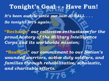 The Army Intelligence Ball is a chance to renew some acquaintances (your Army buddies!); a chance to enjoy an evening of good conversation, good food, and good entertainment; a chance to reconnect with military traditions and customs; a chance to show how well you can dance!